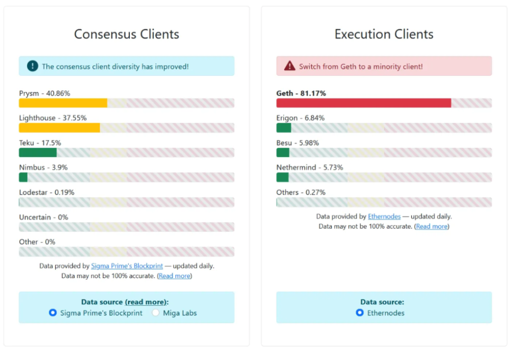 客户端中心化的问题非常严重,甚至像Prysmatic Labs这样客户端使用率最高的领先公司都建议节点验证者“使用他们的竞争对手”。毕竟,如果以太坊崩溃,对所有人来说都是损失。