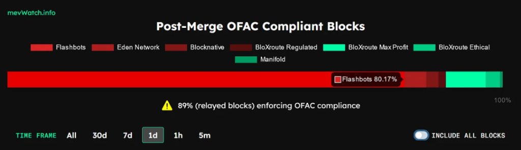 但如果中继器自己选择审查呢?这就把我们带到了中继器层面的中心化风险的核心。今天,以太坊上 58% 的中继区块都在审查 Tornado Cash 交易,即符合 OFAC 的要求。这 58% 的大部分 (80%) 来自于 Flashbots 的中继区块 (见下图)。